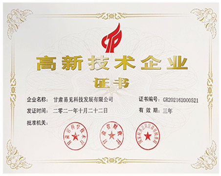 公司于2021年10月22日收到了由國(guó)家科技部認(rèn)證的甘肅省科學(xué)技術(shù)廳、甘肅省財(cái)政廳、國(guó)家稅務(wù)總局甘肅省稅務(wù)局聯(lián)合頒發(fā)的“高新技術(shù)企業(yè)”認(rèn)定證書(shū),由此易見(jiàn)科技正式邁入國(guó)家高新技術(shù)企業(yè)行列。